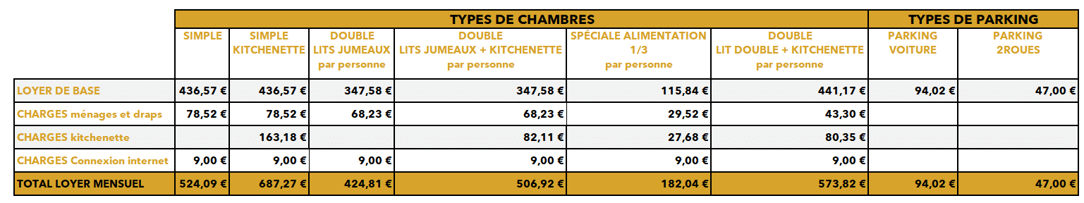 Les tarifs comprennent les prestations obligatoires (ménage et draps) hors assurance, ainsi que le supplément pour les chambres équipées d’une kitchenette. Pour réserver une chambre, vous devez impérativement :
